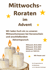 Die Mittwochsmessen im Advent wollen wir auch dieses Jahr wieder als Roraten feiern. Im Anschluss gibt es auch wieder unseren Adventspunsch.